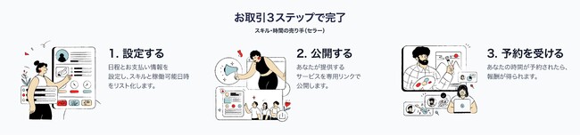 スキルを売りたい場合は、1) スキルや日程などを設定する、2) サービスを公開する、3) 予約を受けたらサービスを提供する、この3ステップで完了です。