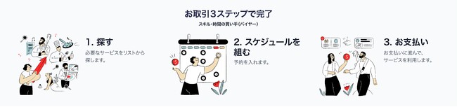 スキルを購入したい場合は、1) 必要なサービスを探す、2) スケジュールを組む、3) お支払いをしてサービスを利用する、この3ステップで完了です。